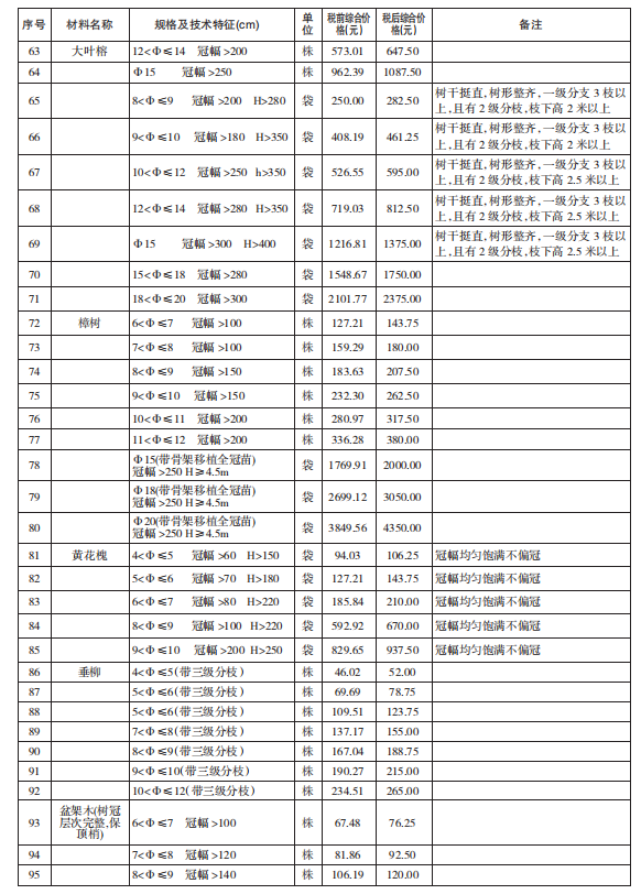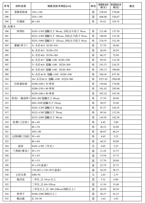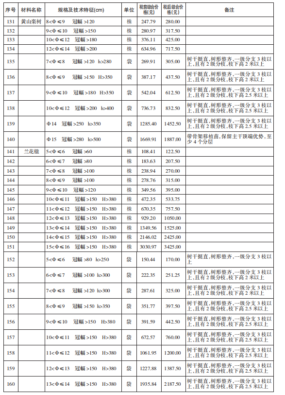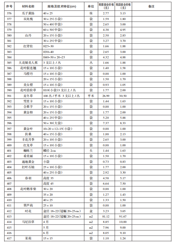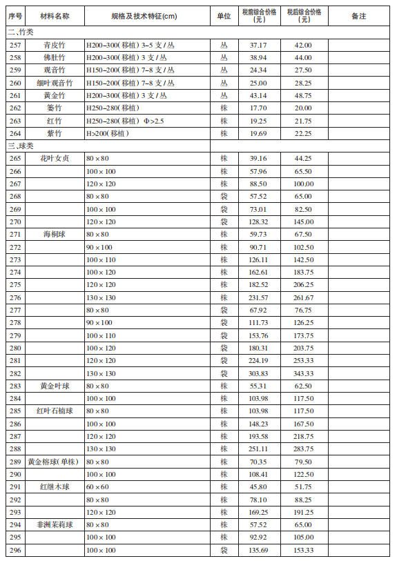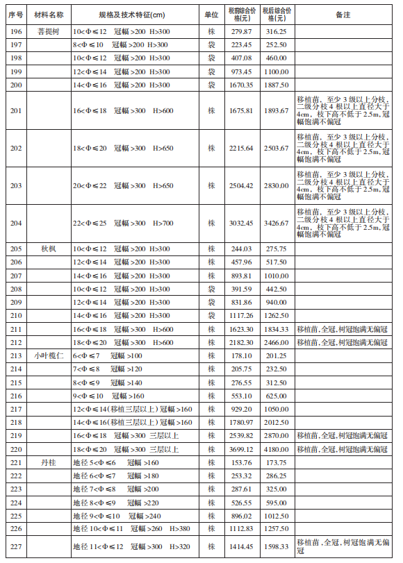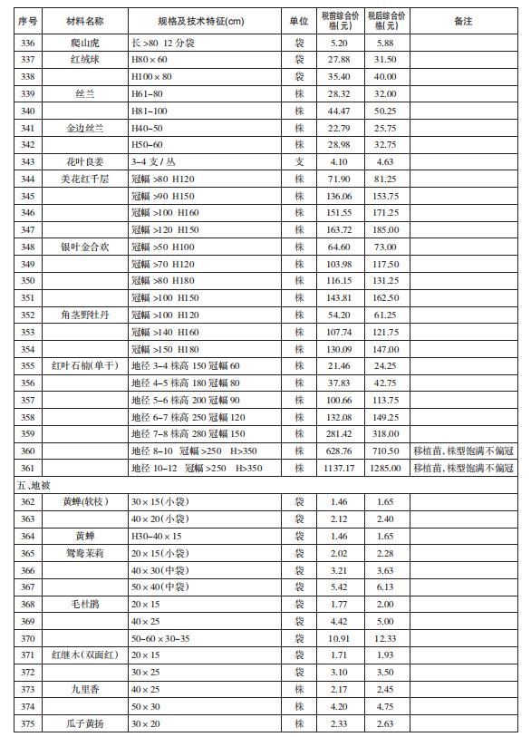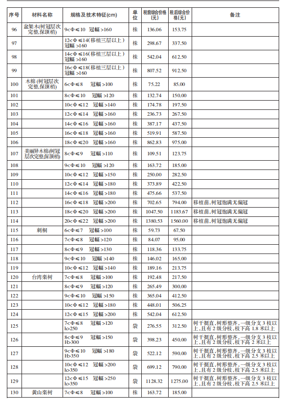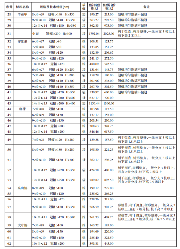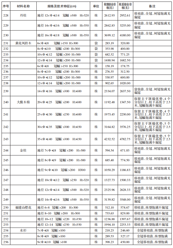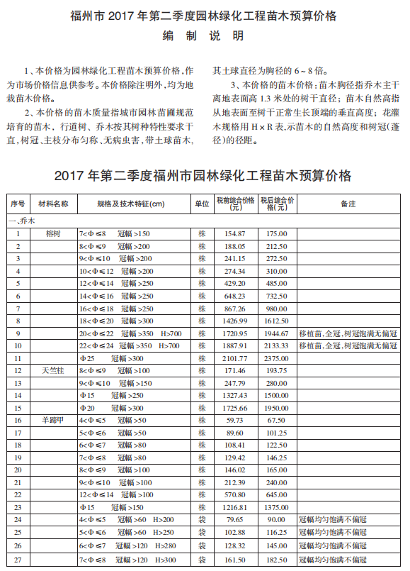 福州市2017年第二季度园林绿化工程苗木预算价格
